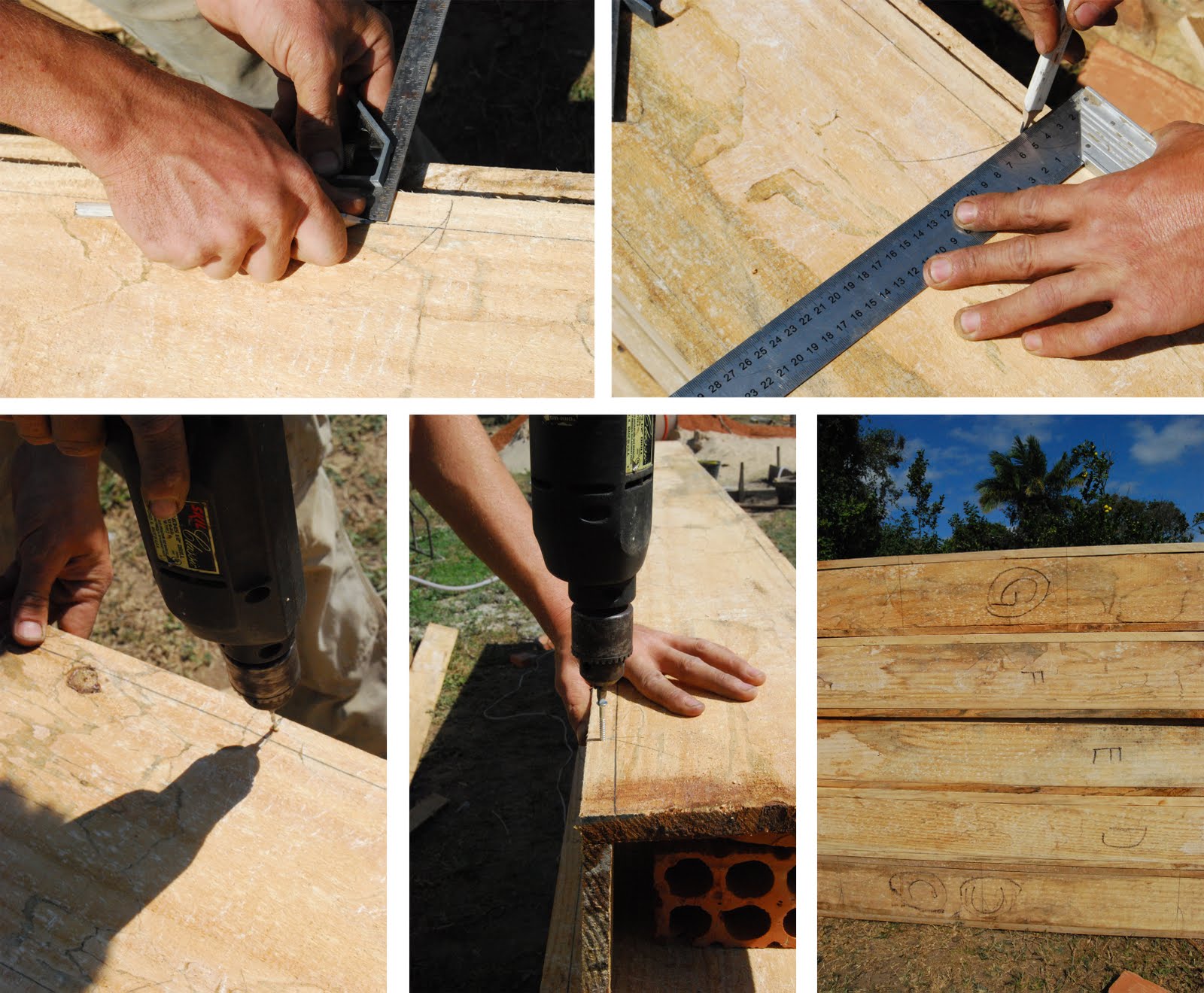 Week 8 has included the building of the four main structural trusses that will be exposed to the interior space and carry the weight of the framing and roofing loads. John and I designed the truss to a specific angle specified by our solar systems engineer and began the build. They are currently cut to fit and tacked together with screws and will eventually receive metal strapping and hardware at all planar connections. The wood type is Piuva, a Brazilian hardwood and is rough sawn at best. It is milled to size with a chain saw (plain sawn technique) and the accuracy is excellent given the tools and conditions. Attention is paid to thickness when cutting stock for the king post and intersecting cords and crowning for all sloped and horizontal members is in the upward direction. The king post is left un-cut at the top where it will receive the ridge beam so fine adjustments can be made according to the varying dimensions of material that it will receive.